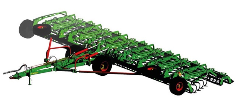 ▶ Рабочими органами культиватора являются секции шириной захвата 2 метра каждая, с собранными в 4 ряда рабочими органами на S-образных стойках. Планчатым механизмом достигается дополнительный выравнивающий эффект. Глубина обработки задаётся изменением положения секции относительно опорно-прикатывающих катков.